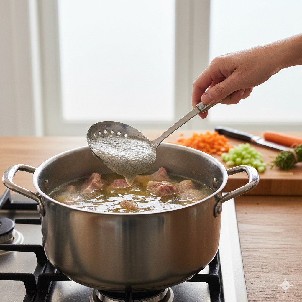 Verás que sale una espuma grisácea. Retírala con un cucharón. Este es el secreto para un caldo cristalino.