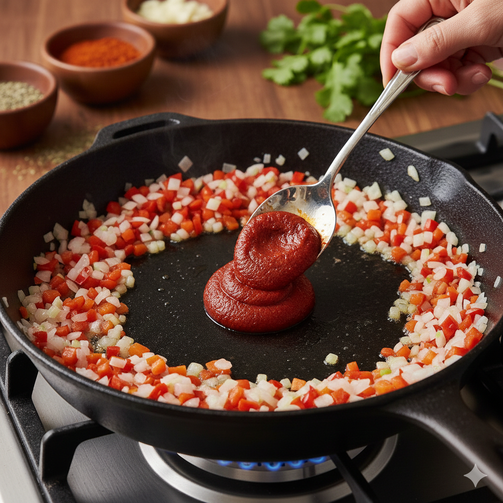 Abre un hueco en el centro del sofrito, añade un poco más de aceite y sofríe allí la pasta de tomate por un minuto antes de mezclar todo. Cocinar la pasta de tomate elimina su acidez metálica y potencia el color rojo.