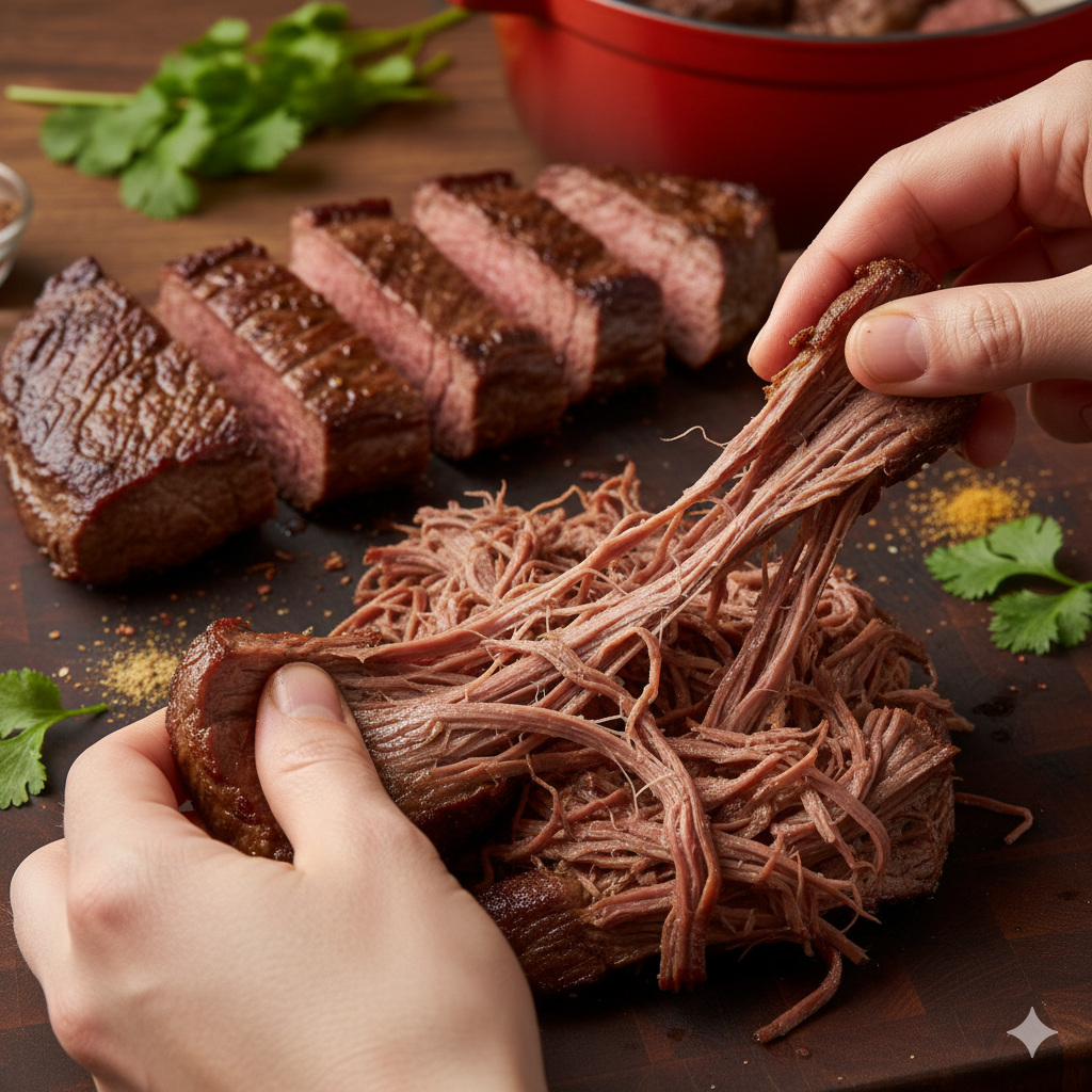 Elige el corte correcto: Evita cortes muy magros como el "muchacho redondo" (pollo ganso). La carne mechada necesita esa grasa interna para brillar.