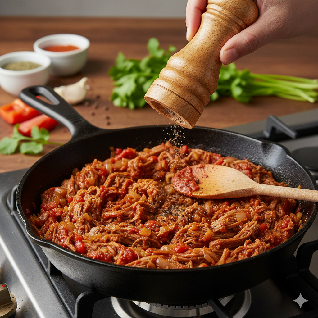 Aprende la técnica definitiva para una carne mechada untuosa. Desde la cocción lenta para obtener colágeno hasta el sofrito rojo con el toque secreto de pasta de tomate.