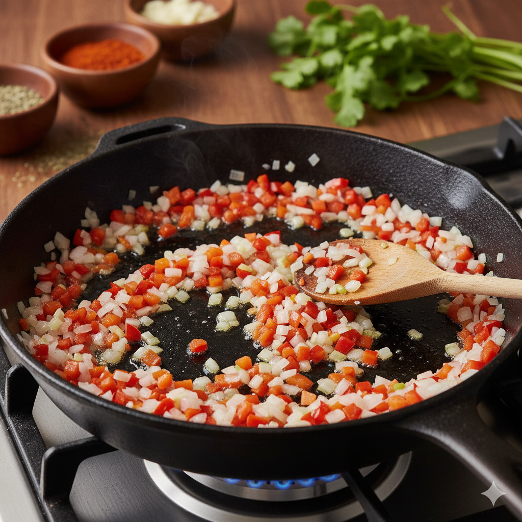 En un sartén con aceite, sofríe la cebolla, el pimentón y el ajo. No busques dorar, sino "marchitar". Queremos que los vegetales suelten sus jugos dulzones suavemente.