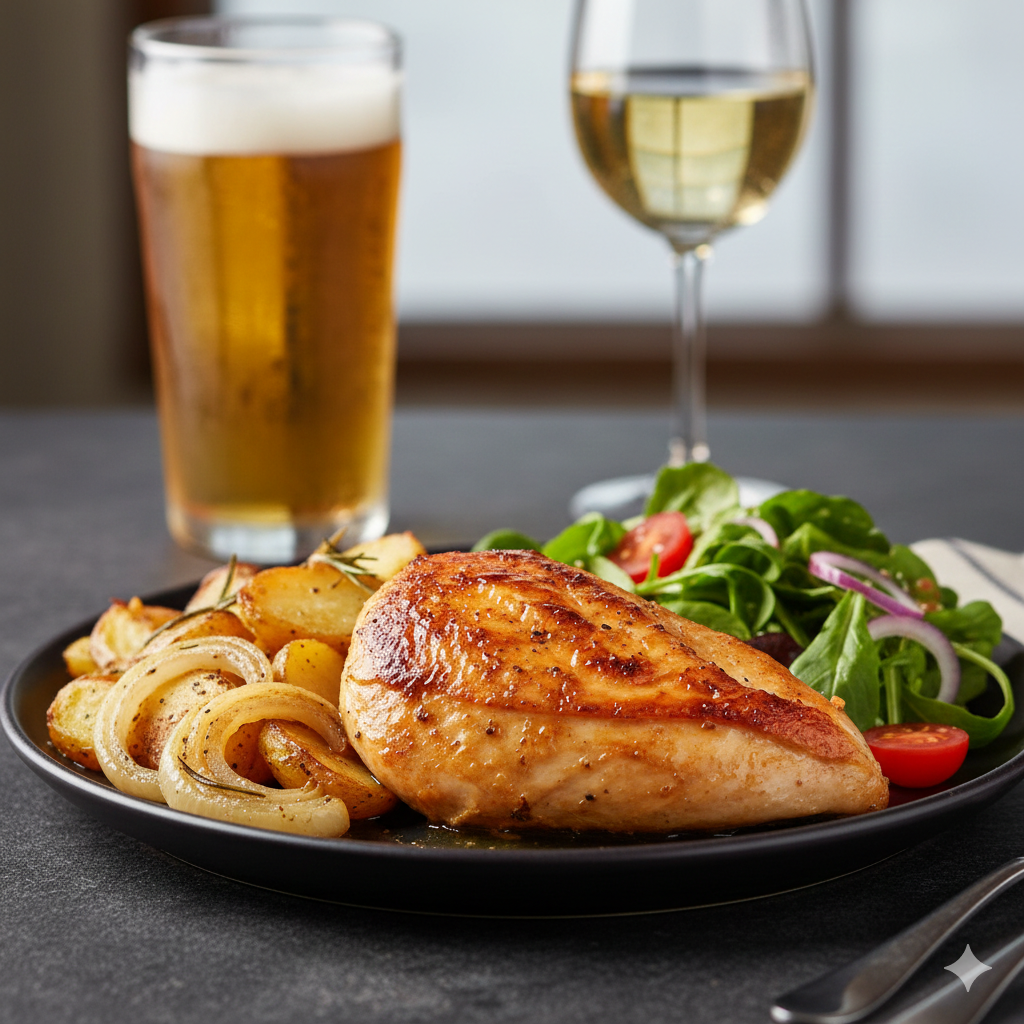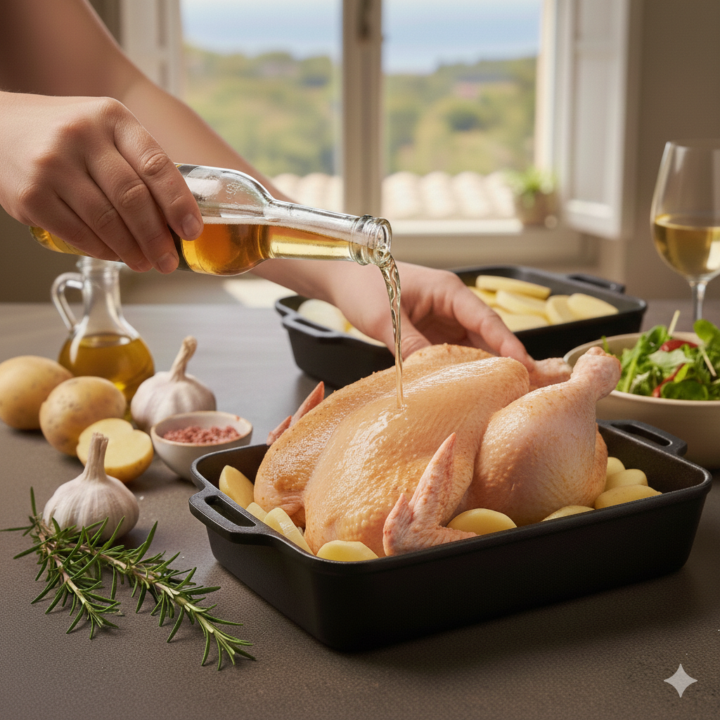 Vierte la cerveza en la base de la bandeja (sin mojar la piel del pollo). Hornea a 180°C durante 60-70 minutos. Cada 20 minutos, baña el pollo con sus propios jugos. ¿Por qué? El vapor de la cerveza mantiene la humedad interna mientras el calor seco del horno tuesta la piel.