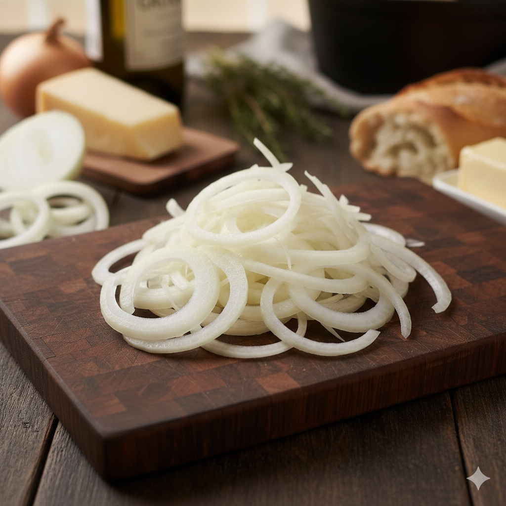 Pela las cebollas y córtalas en juliana fina (tiras longitudinales). El corte uniforme asegura que toda la cebolla se cocine al mismo tiempo y se caramelice parejo.