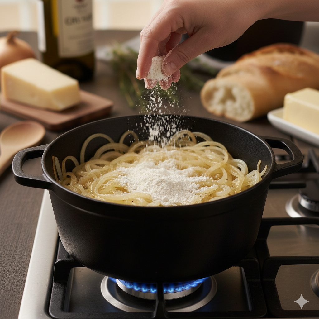 Espolvorea la harina sobre la cebolla y remueve por 2 minutos. Esto "tuesta" la harina (roux) para que la sopa tenga una textura ligeramente más ligada y no sea solo agua.