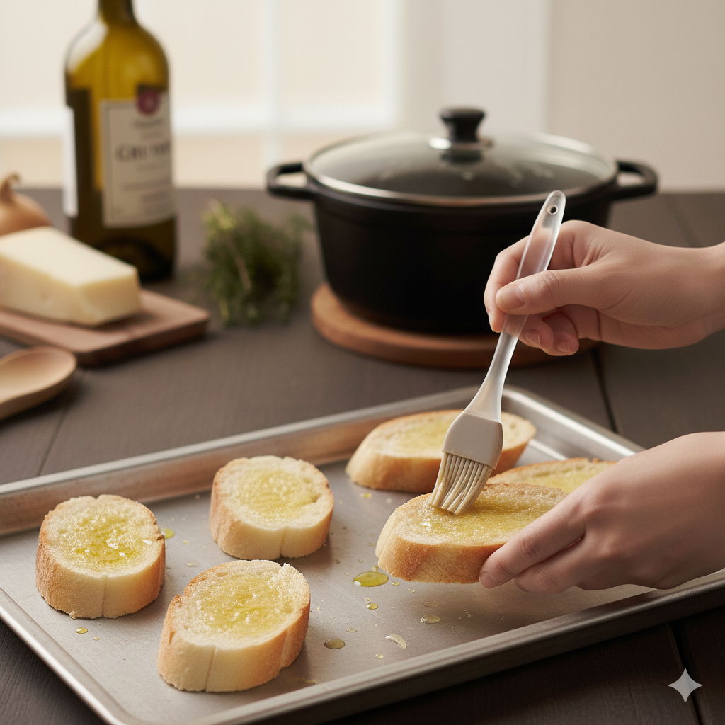 Mientras la sopa reposa, pincela las rodajas de pan con aceite y tuéstalas en el horno a 180°C hasta que estén doradas por ambos lados.